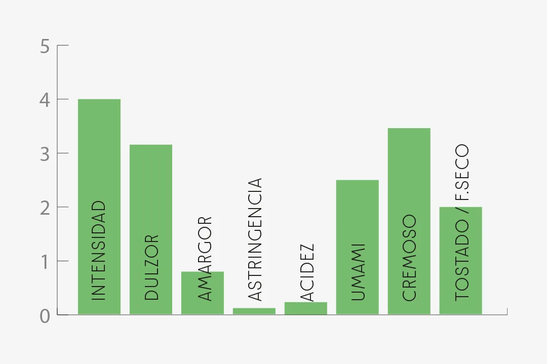 Aroma hoja infusionada: Chirivia cocida, orquidea, esparrago plancha, pera, espelta, chocolate con leche y almendra.