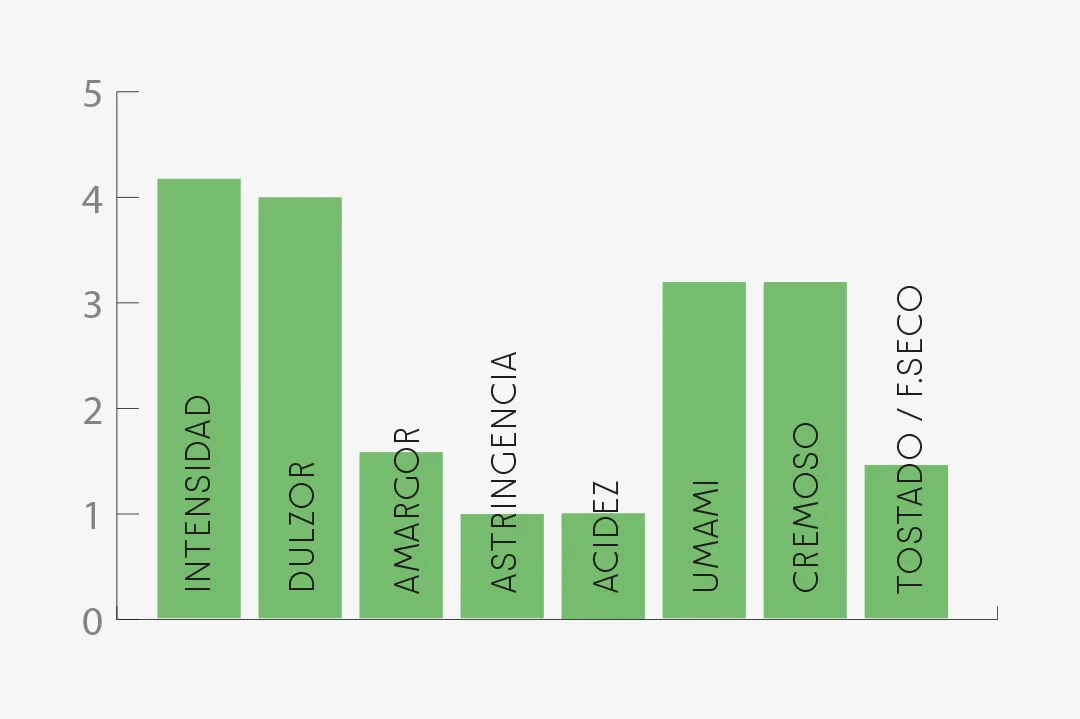 Gusto:Un perfil intenso, donde las sensaciones saladas de carácter mineral y la dulzura natural se equilibran de forma precisa. Exhibe una marcada cualidad umami, con un huigan pronunciado que se expande con claridad. La ligera astringencia aporta estructura sin opacar el resto de sabores, mientras que una sutil pungencia, procedente de los ácidos orgánicos, añade vivacidad al conjunto. El retrogusto es muy largo, con matices cremosos, minerales y frutales, que permanecen en boca con una elegancia persistente.