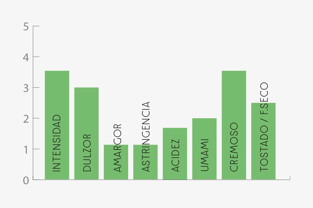 Gusto: Dulzor y carácter salino en intensidad media. Sensación reconfortante en boca, con muy baja astringencia y amargor. Ligera pungencia que aporta viveza. Retrogusto largo, mineral, cremoso y meloso.