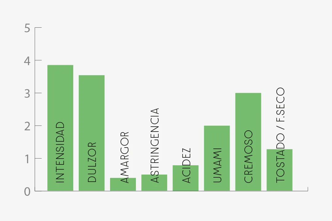 Gusto: Dulzor marcado con un sutil carácter salino y ligera mineralidad. Sensación reconfortante y envolvente, con buena presencia en boca. Retrogusto largo, muy cremoso y con un claro carácter lácteo.