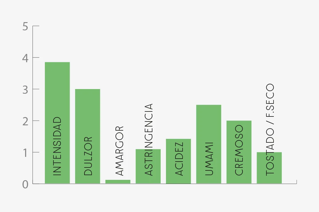 Gusto:Sabor intenso con cuerpo medio. Dulce y mineral, con un punto de acidez y matiz alcanforado bien integrado. Sensación refrescante, ligera pungencia y buena salivación. Retrogusto largo, con carácter alcanforado y cremoso.