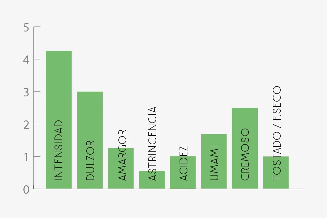 Gusto:Cuerpo y sabor intensos. Dulzor pronunciado con notas umami, acompañadas de una acidez muy sutil, un leve amargor y astringencia mínima. Sensación refrescante en boca, con un retrogusto largo, de carácter lácteo y ligeramente especiado.