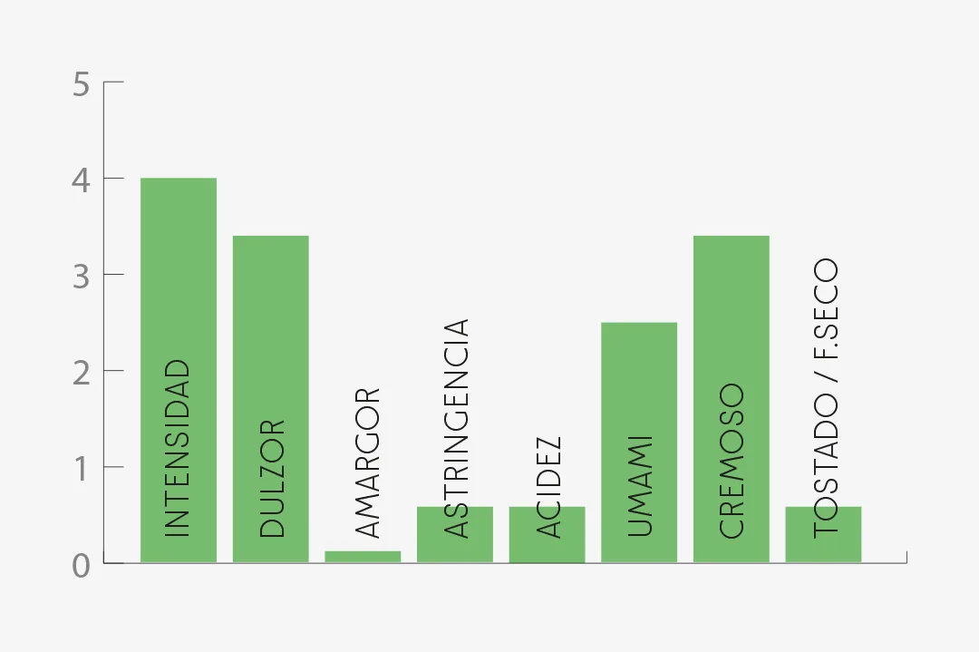Gusto: Sabor intenso y cuerpo medio, con un perfil muy redondo. Dulce y umami bien integrados. Sensación bucal confortable, sedosa y refrescante. Retrogusto medio, de carácter floral.